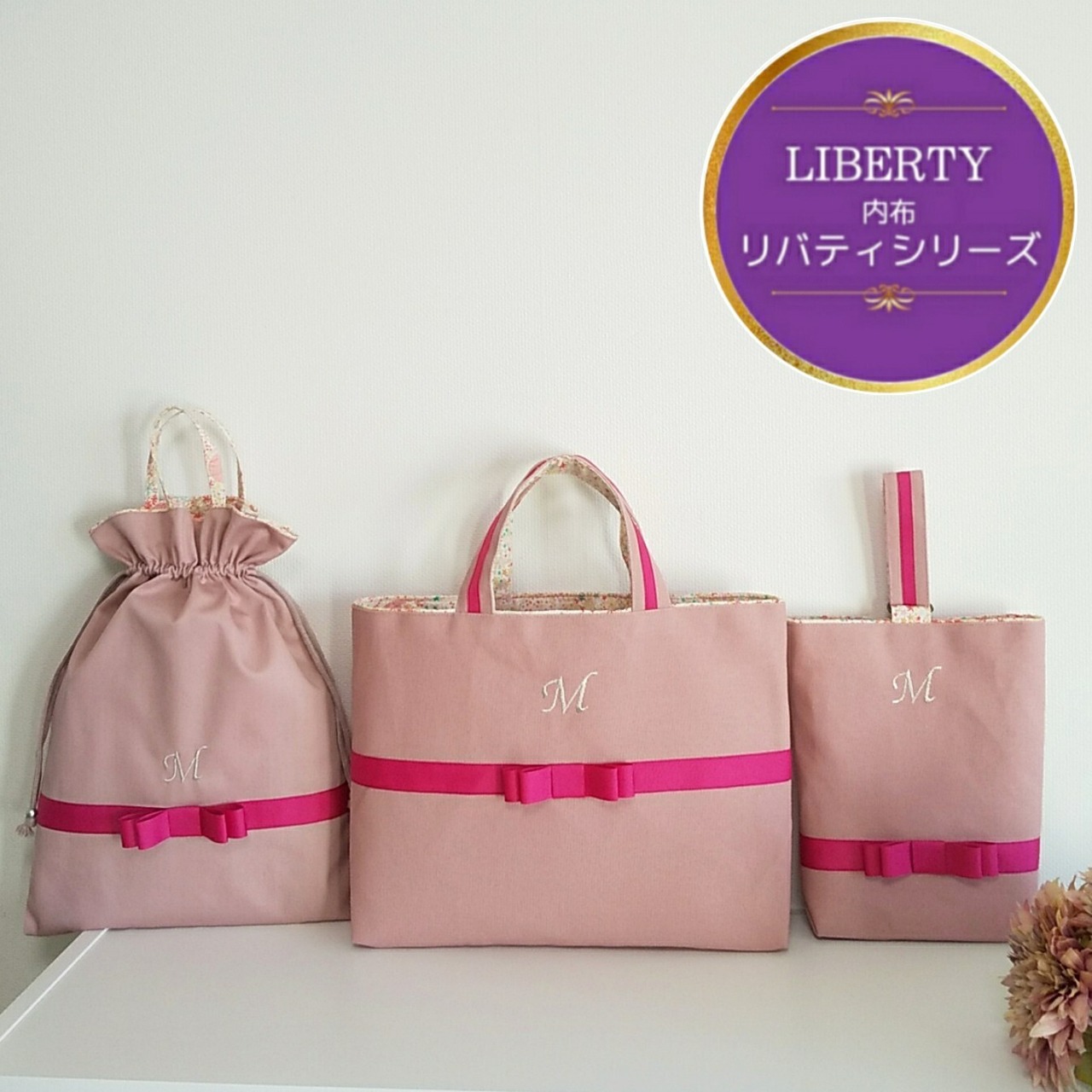*LIBERTY*リバティ【3点セット】くすみピンク×チェリーピンクリボン ~選べるリバティ内布~
