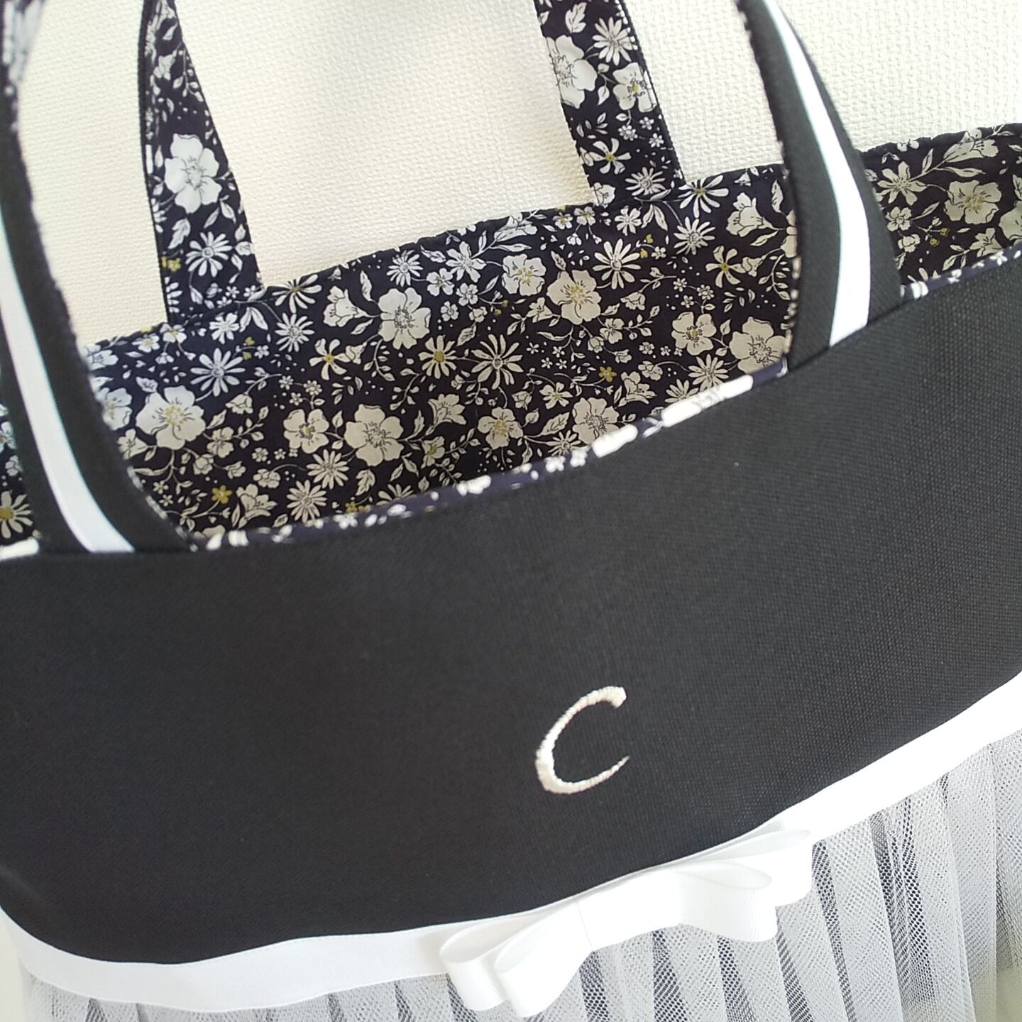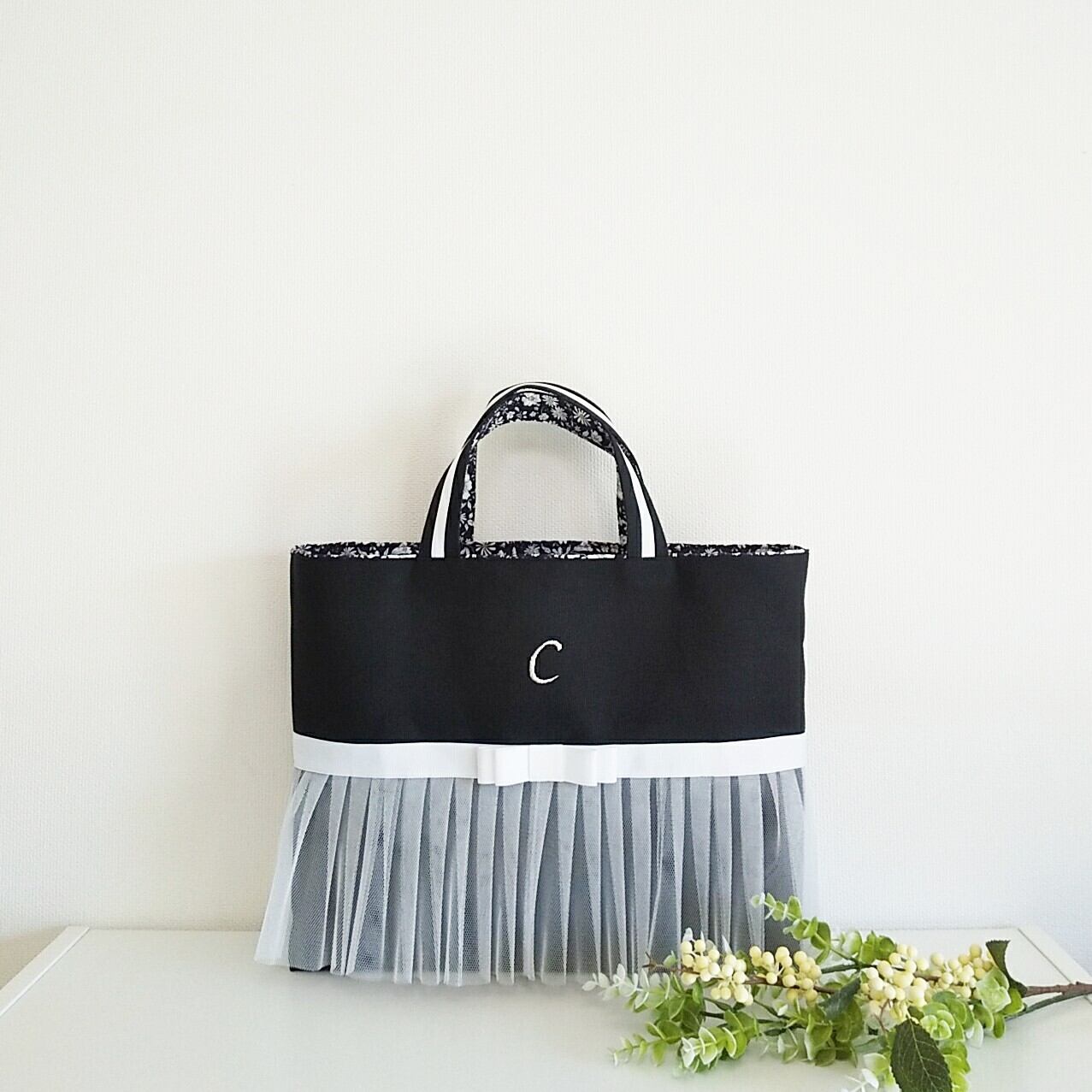 【レッスンバッグ】ブラック×ホワイトリボン ~選べる内布~